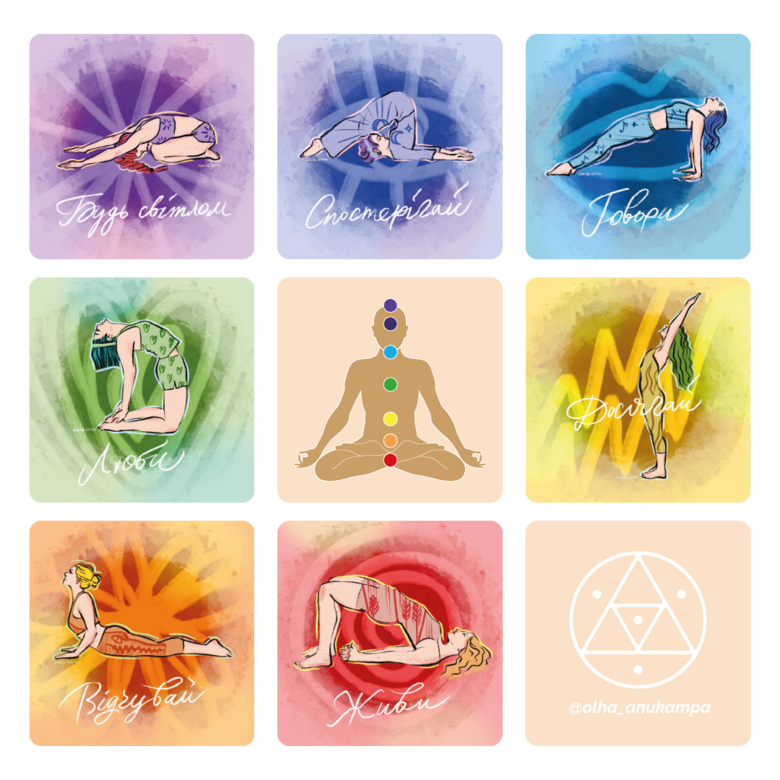 - практики дихання та медитації на кожну чарку (супроводжуючі відео)